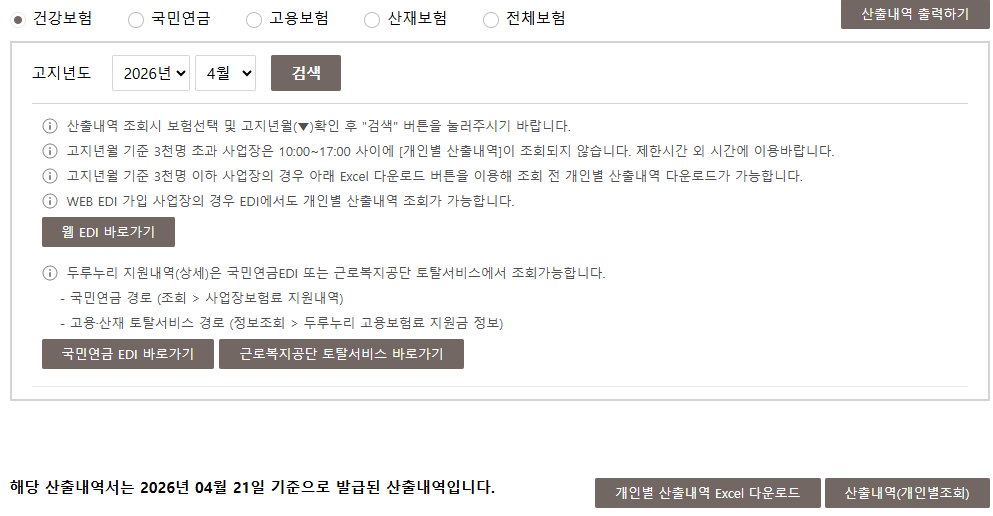 🟣 [고지내역조회] → [보험료 산출내역조회] → [전체보험 체크/고지년도 설정 후 검색] → [산출내역(개인별조회)]